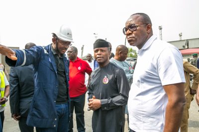 Vice President Yemi Osinbajo, SAN, today Christmas Day with the Minister of State Petroleum Resources Dr. Ibe Kachikwu, continues “on the spot” checks on the fuel situation which he started yesterday with visits to Petroleum depots (Total and Oando) in Apapa. He reassures Nigerians that FG is working round the clock to end the problem at once. He then met with oil executives in a close-door session before his departure. PHOTOS: NOVO ISIORO