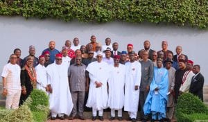 PRESIDENT BUHARI IN AUDIENCE WITH LEADERS OF ABIA STATE 3 President Muhammadu Buhari in a handshake with the Governor Okezie Ikpeazu of Abia State and Leader of the delegation rom South East and host communities of Eyimba Economic City and signing of definitive agreements between the Nigeria Special Economic zone Investment Company Limited and Eyimba City Development Company Limited held at the Council Chambers, State House in Abuja. PHOTO; SUNDAY AGHAEZE.DEC 7 2018