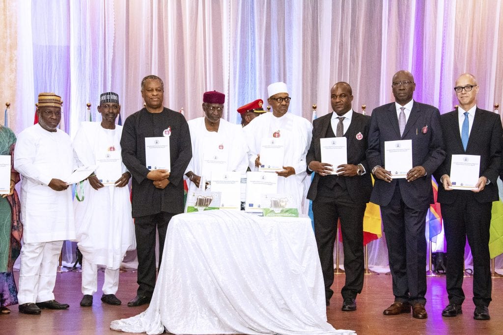 PRESIDENT BUHARI DECLARES OPEN WORKSHOP ON CORRUPTION RISK ASSESSMENT 6A&B. BOOK PRESENTATION: President Muhammadu Buhari (M) flanked by Chief of Staff, Mallam Abba Kyari (left) and ICPC Acting Chairman, Dr Musa Usman Abubakar (right). With them are SGF Mr Boss Mustapha, Minister of Foreign Affairs, Mr Geoffrey Onyeama, FCT Minister Mallam Mohammed Musa Bello and others during the opening ceremony of the training workshop on corruption risk assessment for the heads of anti-corruption agencies in Africa held at the banquet hall. State House Abuja. PHOTO; SUNDAY AGHAEZE. DEC 10 2018
