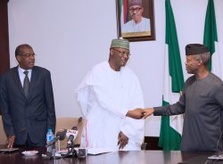 ice President, Professor Yemi Osinbajo presenting Certificate of  Performance discharging  Transcorp Plc of post privatisation performance obligations in respect of Transcorp  Hilton Hotel, Abuja  to  the Chairman, Transcorp Plc ( Core Investor of Transcorp Hilton Hotel, Abuja), Mr. Tony Elumelu,  while the Minister of Finance, Budget and National Planning, Hajia Zainab Ahmed (middle) watched, during a  meeting of National Council on Privatization chaired by the Vice President at the Presidential Villa, Abuja on Monday.