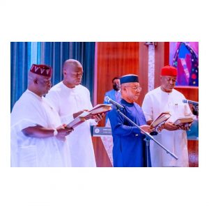 Those sworn in are: Henry Ikechukwu Ikoh (Abia), Minister of State, Science and Technology; Umana Okon Umana (Akwa-Ibom), Minister of Niger Delta Affairs; Udi Odum (Rivers), Minister of State, Environment; Ademola Adegoroye (Ondo), Minister of State, Transport; Umar Ibrahim El-Yakub (Kano), Minister of State, Works and Housing; Goodluck Nana Opiah (Imo), Minister of State, Education; and Ekumankama Nkama (Ebonyi), Minister of State, Health.