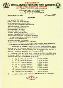 A circular states: “The president of the federal republic of Nigeria has approved the upward review of duty tour allowances applicable to Permanent Secretary/Equivalent from N20,0000 to N70,000, and to minister/SGF/HCSF/Equivalent from N35,000 to N80,000.