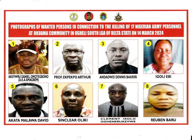 The Defence Headquarters has declared eight people wanted over the recent killing of 17 military personnel in Okuama community, Delta State.