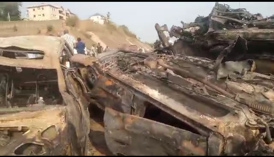 The accident occurred when a cement laden Dangote trailer which had a compartment containing two big cylinders with compressed gas behind the trailer head caught fire after colliding with stationary vehicles.