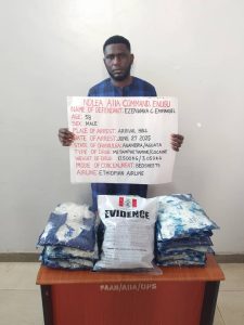 “At Enugu’s Akanu Ibiam International Airport(AIIA), NDLEA operatives intercepted Ezenwaka Chibuzor Emmanuel, a bar attendant based in Maputo, Mozambique, on Friday, June 27. A search of his luggage revealed 17 cardboard-sized parcels of methamphetamine weighing 17.500 kilograms and three parcels of cocaine weighing 3.050 kilograms.