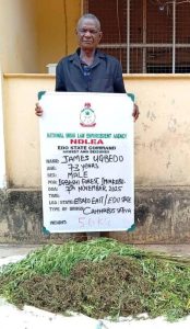 It added: “A 73-year-old grandpa James Ugbedo was on Friday, November 7 arrested in a cannabis plantation at Igbeshi forest, Imiakebo, Etsako East LGA, Edo state where 1,459.75kg skunk was destroyed and 5.6kg of same substance evacuated.